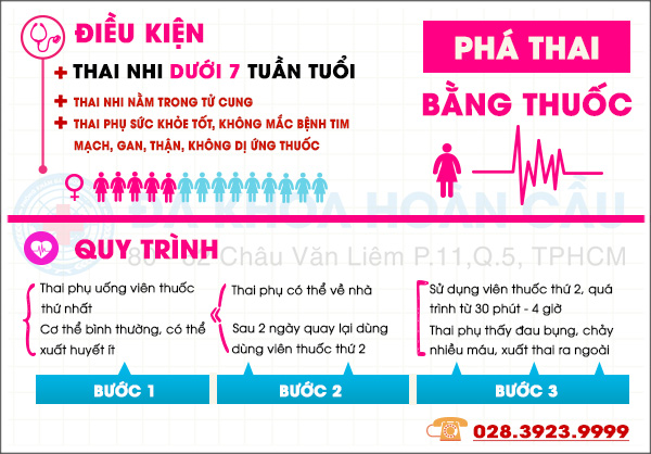 Chị em có thể đến Trung Tâm Kế Hoạch Sinh Sản Hoàn Cầu (số 80 - 82 Châu Văn Liêm, P11, Q5, TPHCM) thăm khám lâm sàng, xét nghiệm máu, siêu âm,… để tính tuổi thai và kiểm tra sức khỏe thai phụ. Trong trường hợp áp dụng được phương pháp phá thai nội khoa bằng thuốc, chuyên gia sẽ thực hiện quy trình như sau: